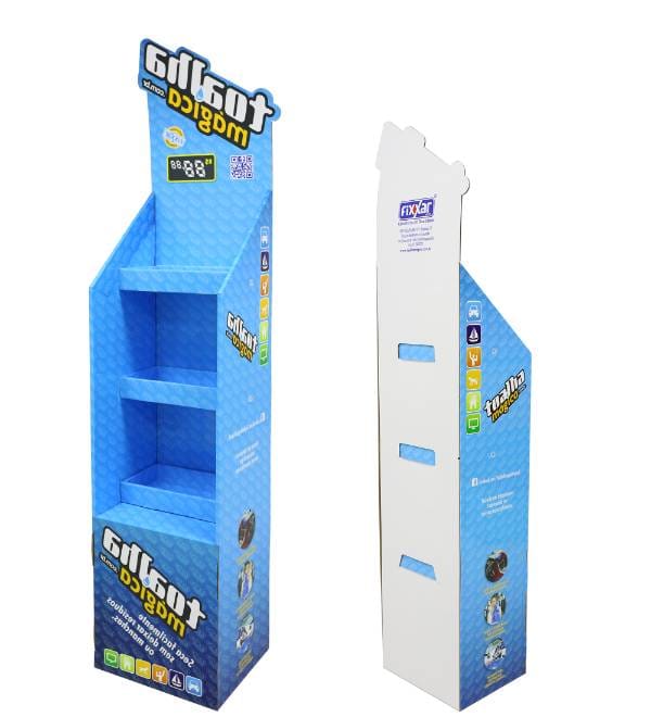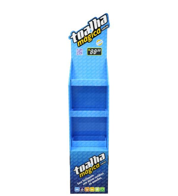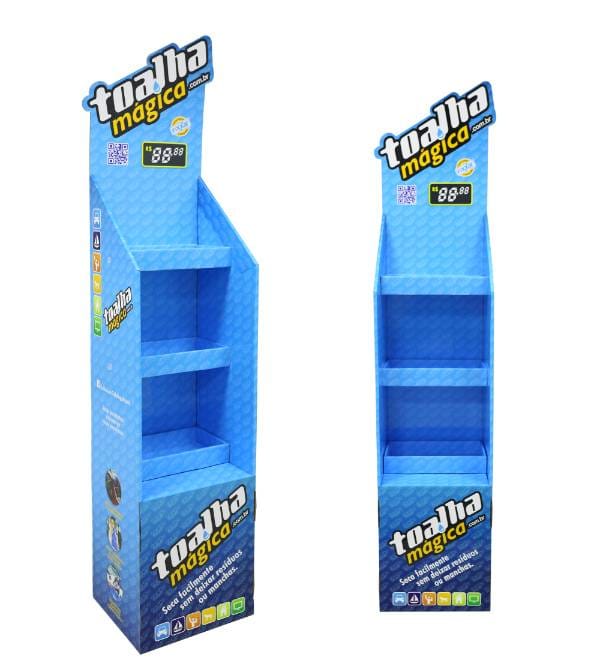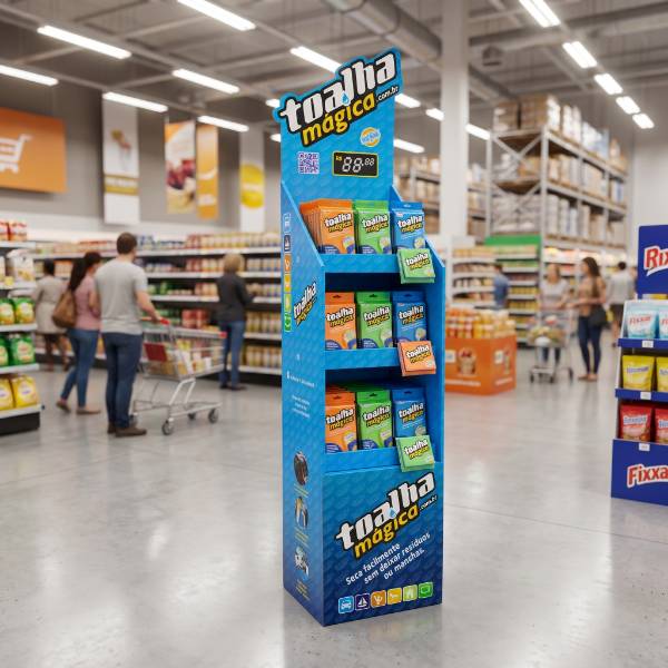 This vibrant blue cardboard floor display is specifically engineered for cleaning products, automotive detailing supplies, and household essentials. Unlike standard shelving, our custom Cardboard Displays provide high-impact visibility for specialty brands like Toalha Mágica. The striking hexagonal pattern and open-access shelf profile capture customer attention in high-traffic zones, while the 3-tier structure maximizes product load without consuming excessive floor space. As a versatile Floor Display, this fixture acts as a persuasive point of purchase (POP) tool to drive impulse buys and increase overall basket size in grocery or hardware environments.
