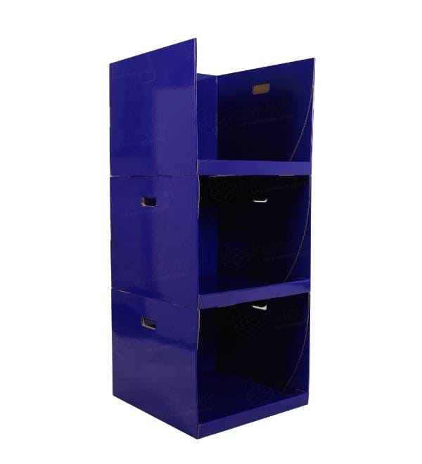 This professional blue cardboard floor display is expertly designed to command attention in busy grocery and convenience store environments. Unlike generic metal racking, our custom Cardboard Displays provide a dedicated space for specialty food brands to stand out. The deep blue finish creates a premium backdrop for high-contrast packaging, such as tea tins, coffee bags, or gourmet snacks. This 3-tier modular bin structure maximizes vertical space, acting as a highly effective point of purchase (POP) fixture that encourages impulse buys in high-traffic retail zones.