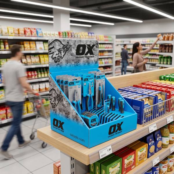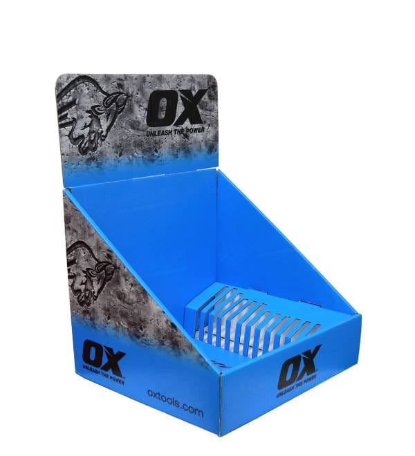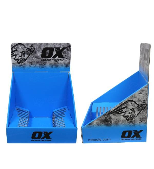 This vibrant blue cardboard display is specifically engineered for hardware and DIY retail environments to showcase premium hand tools. Unlike standard flat shelving, our custom Cardboard Displays offer superior organization for brands like OX Tools. The bold blue print and integrated slatted dividers attract professional tradespeople and homeowners in high-traffic zones, while the compact footprint maximizes counter space. As a versatile Counter Display, this unit acts as a high-impact point of purchase (POP) fixture designed to turn browsers into buyers.
