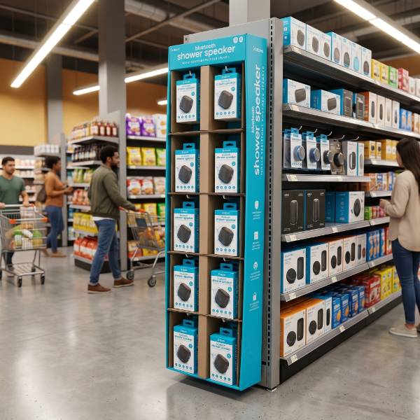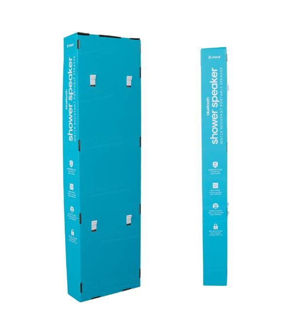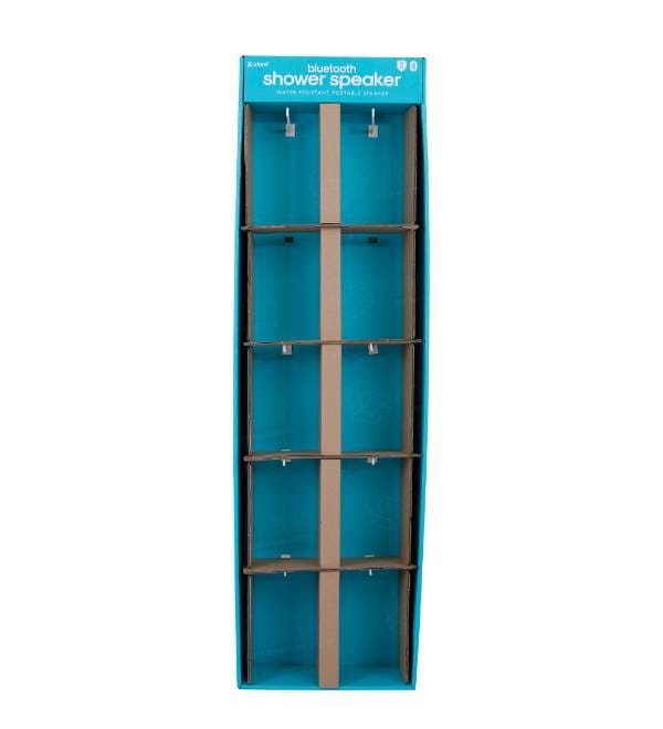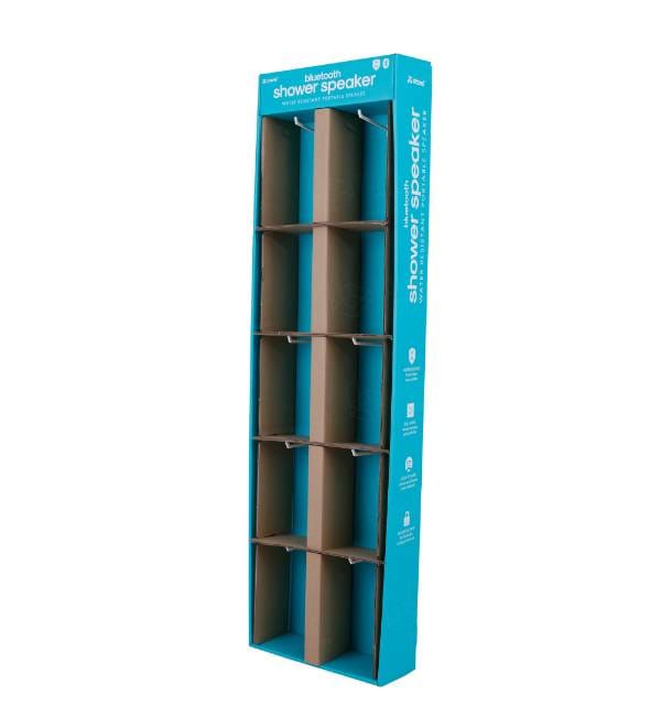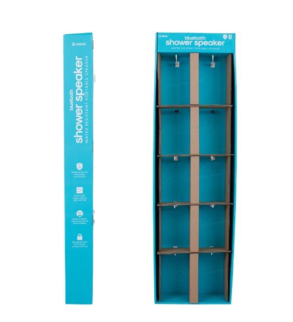 This striking blue cardboard floor display is specifically engineered for high-visibility tech and consumer electronics retail environments. Unlike standard flat shelving, our custom Cardboard Displays utilize a vertical peg hook system to offer superior visibility for impulse-buy gadgets like Atomi Bluetooth shower speakers. The vibrant blue branding and slim, space-saving profile attract customer attention in high-traffic zones, while the 10-hook configuration maximizes product density without cluttering the aisle. As a high-impact Floor Display, this unit serves as a primary point of purchase (POP) fixture to drive conversions in electronics departments and checkout lanes.
