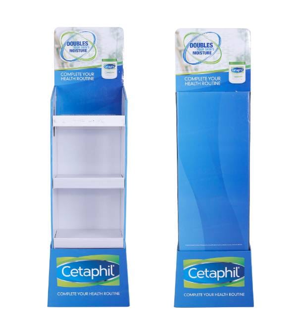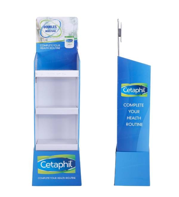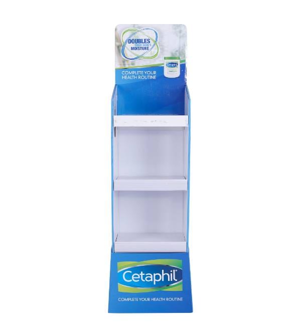 This professional blue cardboard floor display is specifically engineered for Beauty & Personal Care retail environments. Unlike standard shelving, our custom Cardboard Displays offer high visibility for leading skincare brands like Cetaphil. The vibrant blue print and accessible shelf profile attract customer attention in high-traffic pharmacy and grocery zones, while the 3-tier structure maximizes product load without taking up valuable floor space. As an effective Floor Display, this unit acts as a powerful point of purchase (POP) fixture to increase basket size and highlight “Complete Health Routine” marketing campaigns.