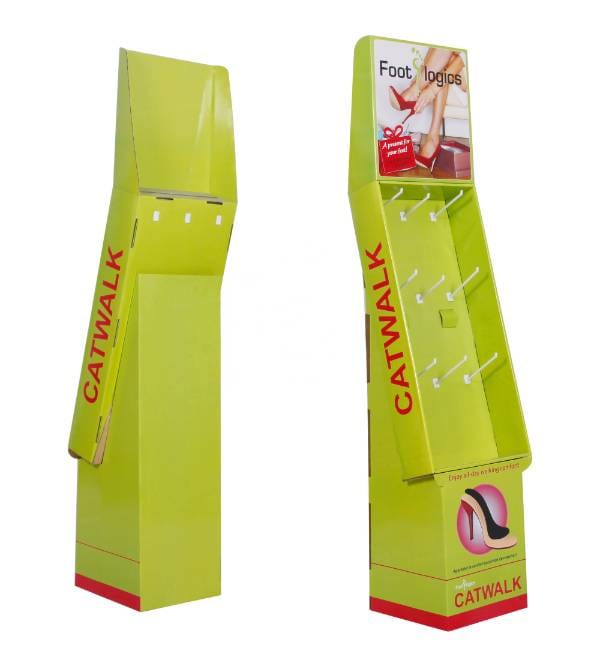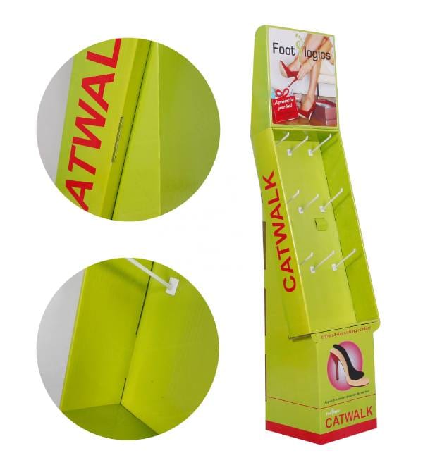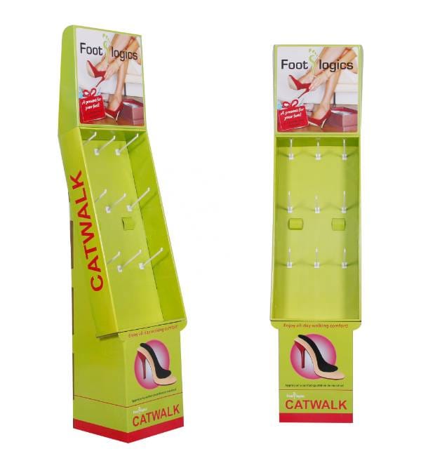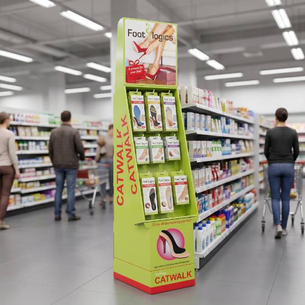 This eye-catching green custom printed cardboard display is precision-engineered to boost visibility for health and wellness products in retail environments. Unlike standard shelving, our custom Cardboard Displays are designed specifically to showcase hanging items like Foot Logics orthotics or CATWALK footwear inserts. The vibrant lime green graphics and unique slanted profile draw the shopper's eye from across the store, while the space-saving footprint allows for strategic placement in high-traffic zones. As a versatile Floor Display, this unit serves as a high-impact point of purchase (POP) fixture that effectively converts browsing into buying.