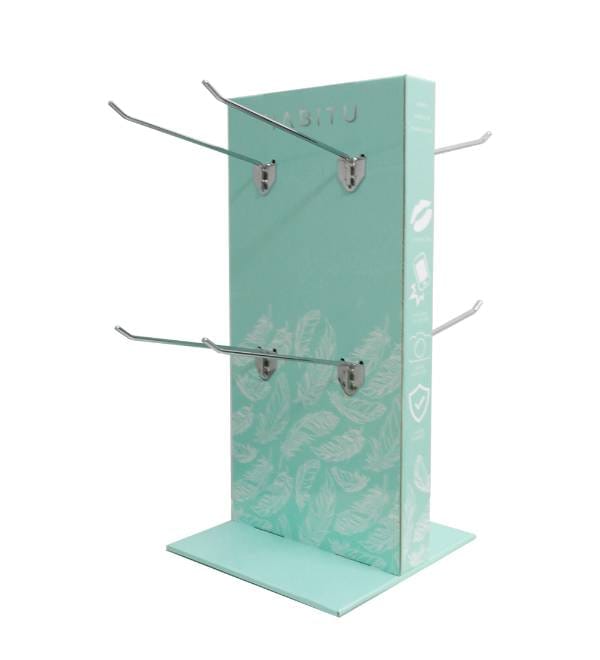 This elegant mint green cardboard display is expertly crafted for the competitive beauty and personal care retail sector. Designed to maximize vertical space, our custom Cardboard Displays provide a premium presentation for hanging items like face masks, lip balms, and travel kits. The soothing aesthetic and feather pattern create an inviting look in high-traffic retail zones, while the double-sided peg configuration doubles your product exposure without increasing the footprint. As a versatile Peg Hook Display, this unit serves as a high-impact point of purchase (POP) fixture that drives impulse buys near checkout counters or within specialized beauty aisles.