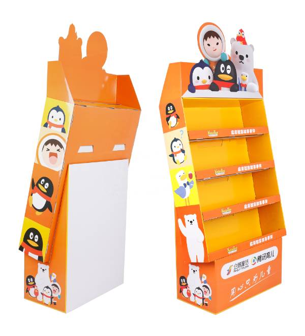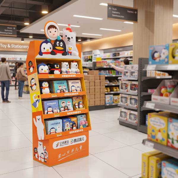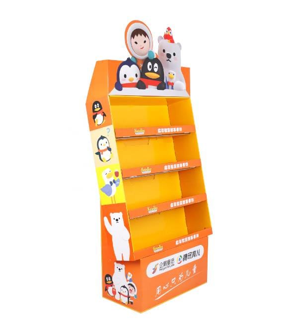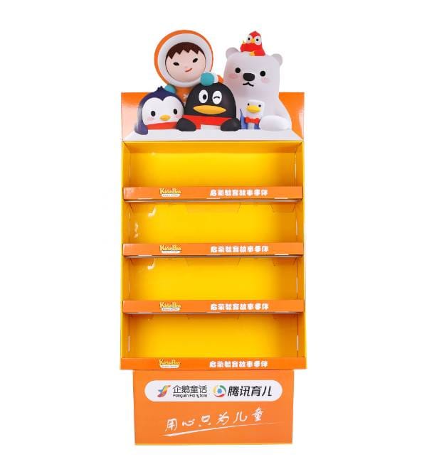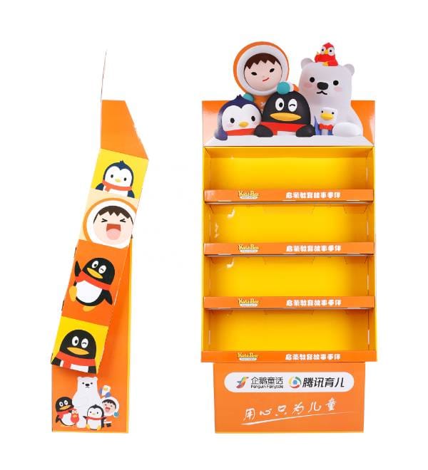 This vibrant orange cardboard floor display is specifically engineered for the high-energy environment of toy stores and children's sections in retail markets. Unlike standard metal shelving, our custom Cardboard Displays offer exceptional storytelling potential for brands like Penguin Fairytale and Tencent Kids. The multi-colored character graphics and open-shelf profile attract young shoppers in high-traffic zones, while the 4-tier structure maximizes product visibility for plush toys, books, and educational kits without occupying excessive floor space. As a highly effective Floor Display, this unit serves as an engaging point of purchase (POP) fixture designed to drive impulse buys and brand loyalty.