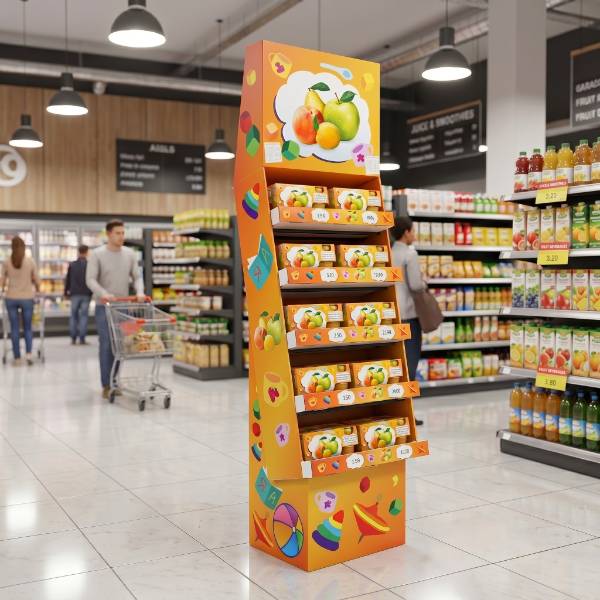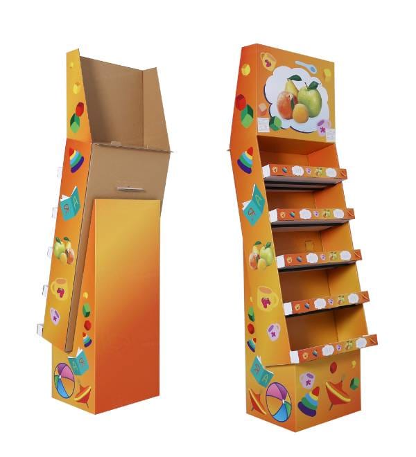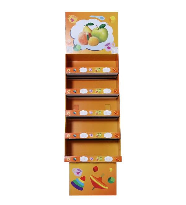 This vibrant orange custom-printed Cardboard Display is specifically designed to captivate shoppers in high-traffic retail environments. Featuring a slanted profile and five spacious tiers, this unit is ideal for merchandising fruit snacks, beverages, or small toys. Unlike traditional flat shelving, this Floor Display uses a stepped design to ensure that products on the lower levels remain fully visible to passing customers. The playful graphics, featuring fresh fruit and colorful childhood toys, make it a versatile retail fixture for both grocery aisles and toy departments.