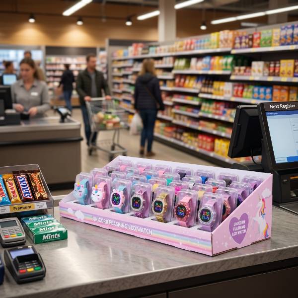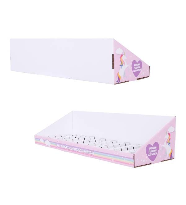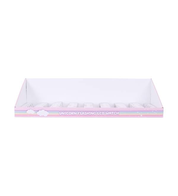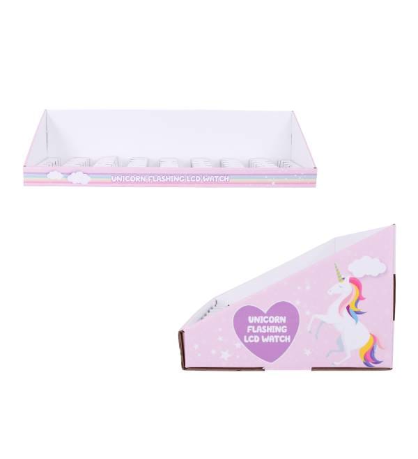 This vibrant pink cardboard display is specifically designed to capture the imagination of young shoppers in toy and gift retail environments. Unlike bulky permanent fixtures, our custom Cardboard Displays offer exceptional visibility for high-turnover items like the Unicorn Flashing LCD Watch. The eye-catching rainbow graphics and whimsical unicorn illustrations are strategically placed to attract attention in high-traffic checkout zones. As a highly effective Counter Display, this unit serves as a compact point of purchase (POP) solution that turns unused counter space into a profit center for impulse novelty items.