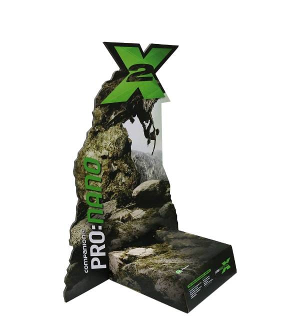 This eye-catching grey and green cardboard display is specifically engineered to capture the attention of outdoor enthusiasts and hikers in a retail setting. Unlike standard flat-pack shelving, our custom Cardboard Displays feature a unique rock-contoured backer that mirrors the rugged environment where your products are used. This specific unit, designed for the PRO:nano X2 cooking system, uses high-impact rock climbing imagery to create an emotional connection with consumers. As a compact Counter Display, it effectively utilizes limited shelf space or checkout areas to drive impulse purchases and increase brand recognition for technical outdoor equipment.