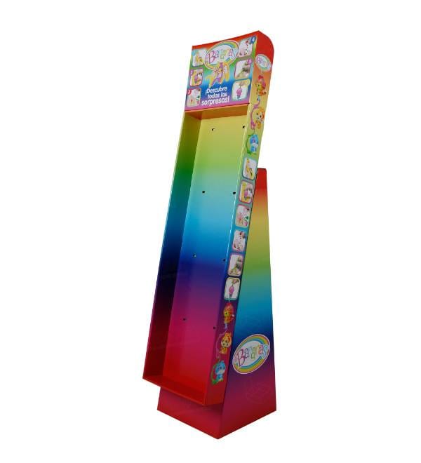 This vibrant rainbow cardboard floor display is expertly crafted for high-energy toy retail environments. Designed to showcase the popular Bananas collectible line, our custom Cardboard Displays ensure your brand stands out in crowded aisles. The eye-catching gradient print and integrated peg hook system offer maximum visibility for small, hangable items that often get lost on standard shelves. As a versatile Floor Display, this unit serves as a high-impact point of purchase (POP) fixture that captures the attention of children and parents alike, driving impulsive buying decisions and increasing overall category sell-through.