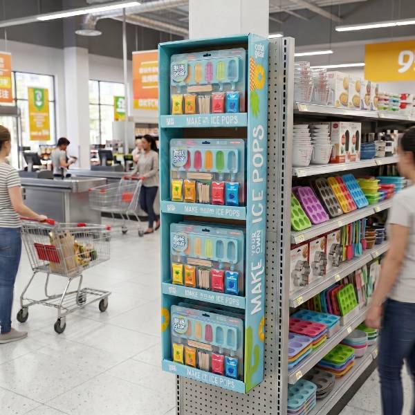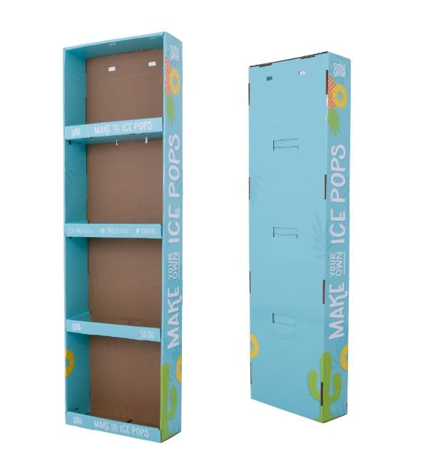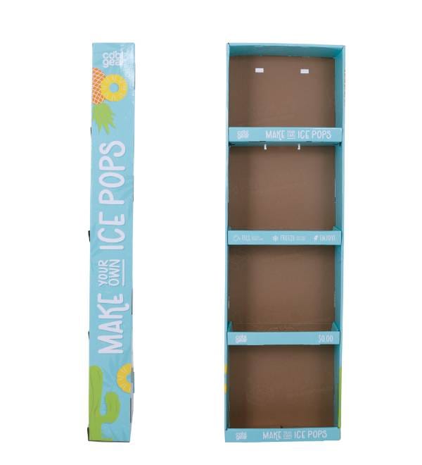 This vibrant teal cardboard display is specifically engineered for high-impulse zones within grocery and houseware environments. Unlike standard floor units, our custom Cardboard Displays are designed as space-saving Sidekicks that attach directly to gondola uprights, offering high visibility for seasonal brands like Cool Gear. The bright tropical graphics and 4-tier open-shelf profile attract customer attention in high-traffic endcap zones, while the slim structure maximizes product density without obstructing narrow aisles. As a versatile Power Wing, this unit acts as a strategic point of purchase (POP) fixture to drive cross-merchandising sales near frozen food or summer sections.