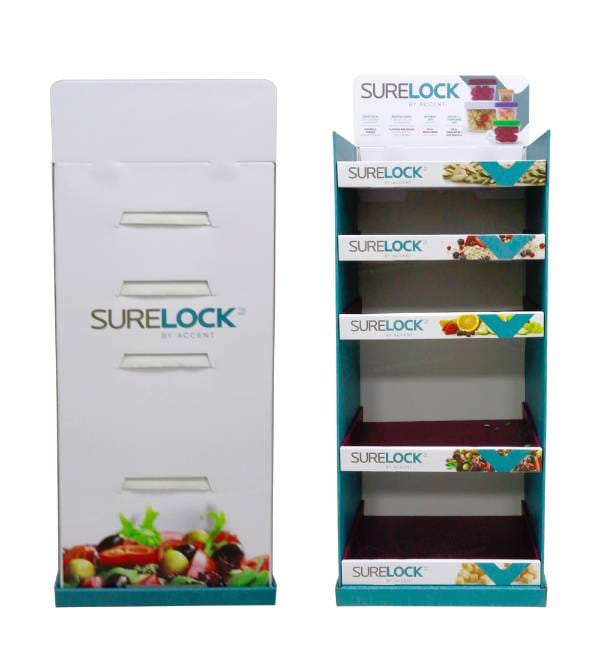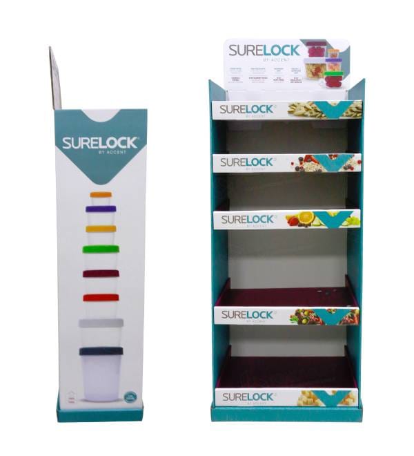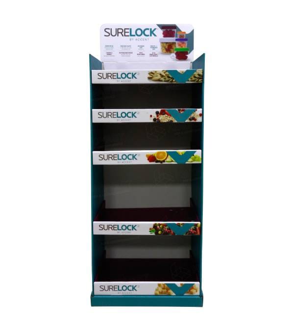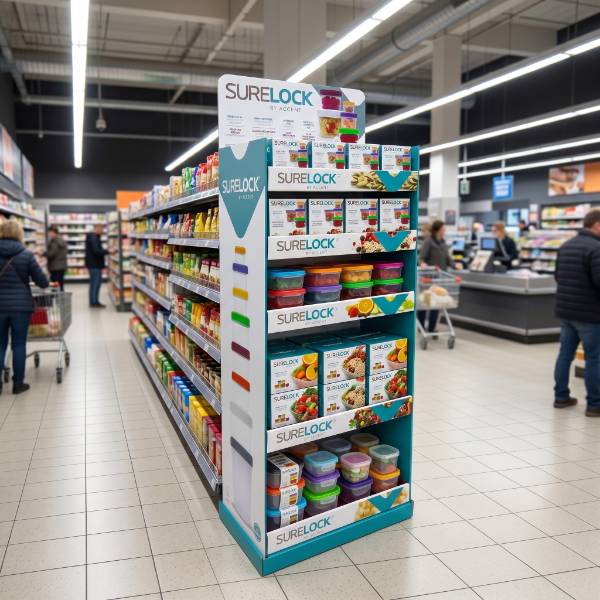 This high-impact teal and white cardboard floor display is specifically engineered to showcase kitchen organization and food storage solutions in demanding retail environments. Unlike standard metal shelving, our custom Cardboard Displays offer superior brand visibility for home essentials brands like SureLock. The vibrant high-definition graphics and accessible 5-shelf profile draw the eye in busy aisles, while the vertical structure maximizes product load without compromising floor space. As an effective Floor Display, this unit serves as a high-performance point of purchase (POP) fixture designed to drive impulse buys and increase overall basket size in grocery and department stores.