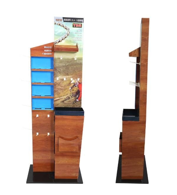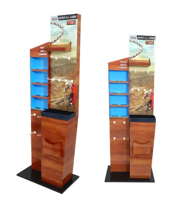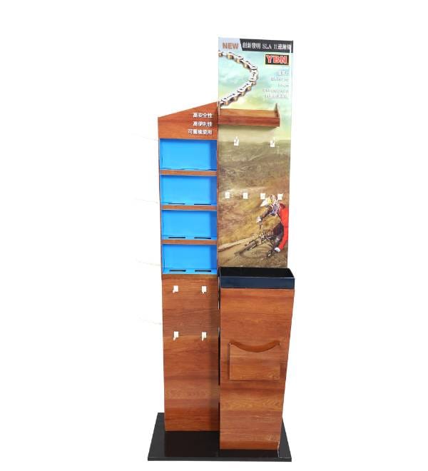 This sophisticated wood-grain cardboard floor display is precision-engineered for the bicycle and hardware retail sector. Unlike generic metal shelving, our custom Cardboard Displays create a high-impact destination for premium technical brands like YBN. The realistic wood print and integrated peg hook system attract cycling enthusiasts in high-traffic retail zones, while the hybrid 4-shelf and hook configuration optimizes product variety without cluttering the floor. As a versatile Floor Display, this fixture functions as a strategic point of purchase (POP) tool to drive impulse sales of chains, lubricants, and essential bike tools.