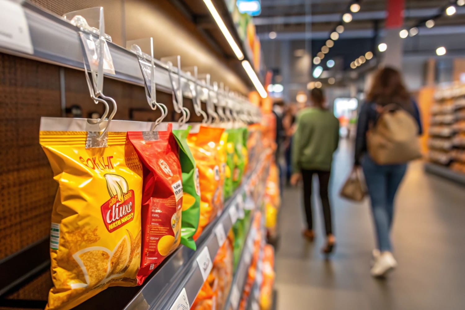 Shoppers scan at eye level. Many packs cannot hang. I add hanging tabs to put small goods where people look first.