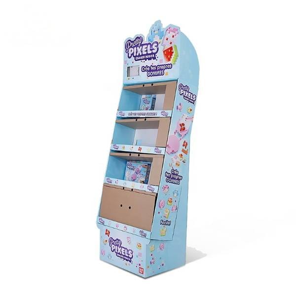 この目を引くライトブルーの段ボール製フロアディスプレイは玩具・ゲーム・エンターテイメント向けに専門的に設計されており、特にPretty Pixels Eraser Makerのようなクリエイティブなクラフトキットに最適化されています。スリムな縦型デザインを採用したこの特注段ボールディスプレイ通路の流れを妨げることなく消費者の関心を引きつけます。4段構成により、多様なSKUを陳列するのに十分なスペースが確保され、高精細グラフィックと型抜きされたヘッダーは、混雑した小売店環境において目を引く存在となります。このユニットは、購入時点で無言のセールスマンとして機能し、衝動買いとブランド認知度向上に貢献する、最高級のフロアディスプレイです。