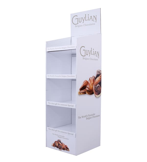 这款优雅的白色纸板落地展示架,设计精巧,旨在提升高端巧克力和糖果品牌在竞争激烈的零售环境中的形象。与普通的金属货架不同,我们定制的纸板展示架提供了一个品牌专属的展示平台,完美展现吉利莲等品牌的奢华气质。洁白的表面和高清的巧克力图片,旨在激发高人流量区域的冲动消费。这款展示架采用宽敞的四层结构,优化了垂直陈列空间,让您无需增加零售空间即可展示各种礼盒和贝壳巧克力。作为一款多功能的落地展示架,它能有效提升销售点(POP)效果,从而促进季节性销售。