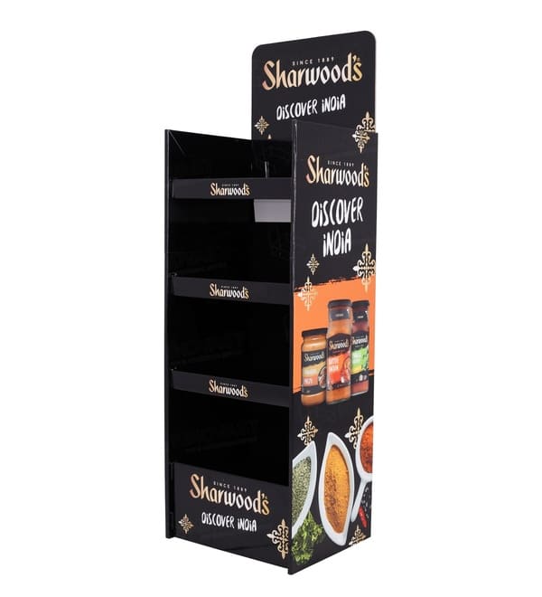 这款高档黑色纸板落地展示架设计精巧,旨在吸引竞争激烈的食品饮料行业的消费者目光。它采用醒目的 Sharwood's “Discover India” 品牌标识,罐装酱料,也可展示轻巧的香料瓶和馕饼包装。作为一款多功能落地展示架,它可作为移动式商品陈列方案,放置在人流密集的通道中,有效促进冲动消费,提升跨品类销售。